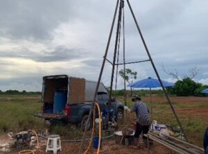 - ติดตั้งโครงสามขา โดยให้จุดศูนย์กลางตรงกับบริเวณหลุมเจาะ